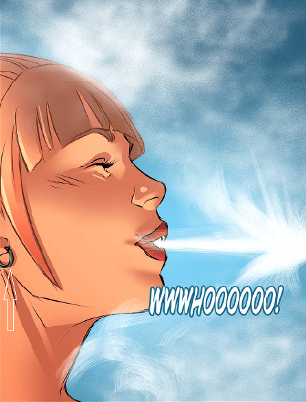 In issue 2 the earrings mysteriously disappeared. Presumably, by that point the artist remembered to stop drawing the earrings. Furthermore, in one panel it seems that a real photo was used for a background and then blurred to make it fit with the drawn figure and drawn clouds of dust. At least, that’s my assumption. The panel in question is shown below. What do you think?