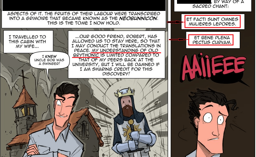 This was not a deal breaker and a decent argument could be made that the grimoire was written in both Brythonic and Latin. (SIDE NOTE: Modern Brythonic, or Brittonic, languages include Cornish and Welsh.) Perhaps Brythonic was used for most of the text while Latin was reserved for certain liturgical or religious sections, like the chant? That would be in keeping with the use of vernacular languages alongside Latin in Roman Catholic church services. My belief is that Jackson referenced Old Brythonic, and King Arthur, to support a fun reference to “Monty Python and the Holy Grail” which I won’t spoil.