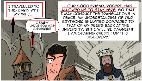 The quality of this illustrated story wasn’t all sunshine and lollipops though. There were a few quibbles to be had. Surprisingly, two minor problems originated on a single page! To begin with, Dash said “I knew Uncle Bob was a swinger!” after learning that an unnamed university researcher and his wife were allowed to stay at Uncle Bob’s, a.k.a. Robert’s, cabin in the woods. Did the fact that a married couple stayed at their friend’s cabin make that friend a swinger? Just because a person allows a couple to stay at their cabin it does not logically follow that the person is having sex with the couple. The cabin owner may not even be physically present while the couple is there. How does this make sense?