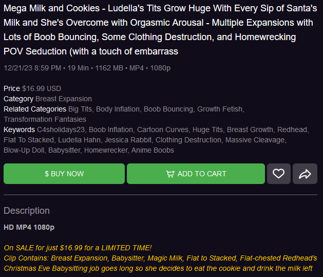 Overall, I strongly recommended Mega Milk and Cookies to B.E. fans. It can be purchased for $16.99 at the following link: https://www.clips4sale.com/studio/36032/28422875/mega-milk-and-cookies-ludellas-tits-grow-huge-with-every-sip-of-santas-milk-and-shes-overcome-with-orgasmic-arousal-multiple-expansions-with-lots-of-boob-bouncing-some-clothing-destruction-and-homewrecking-pov-seduction-with-a-touch-of-embarrass