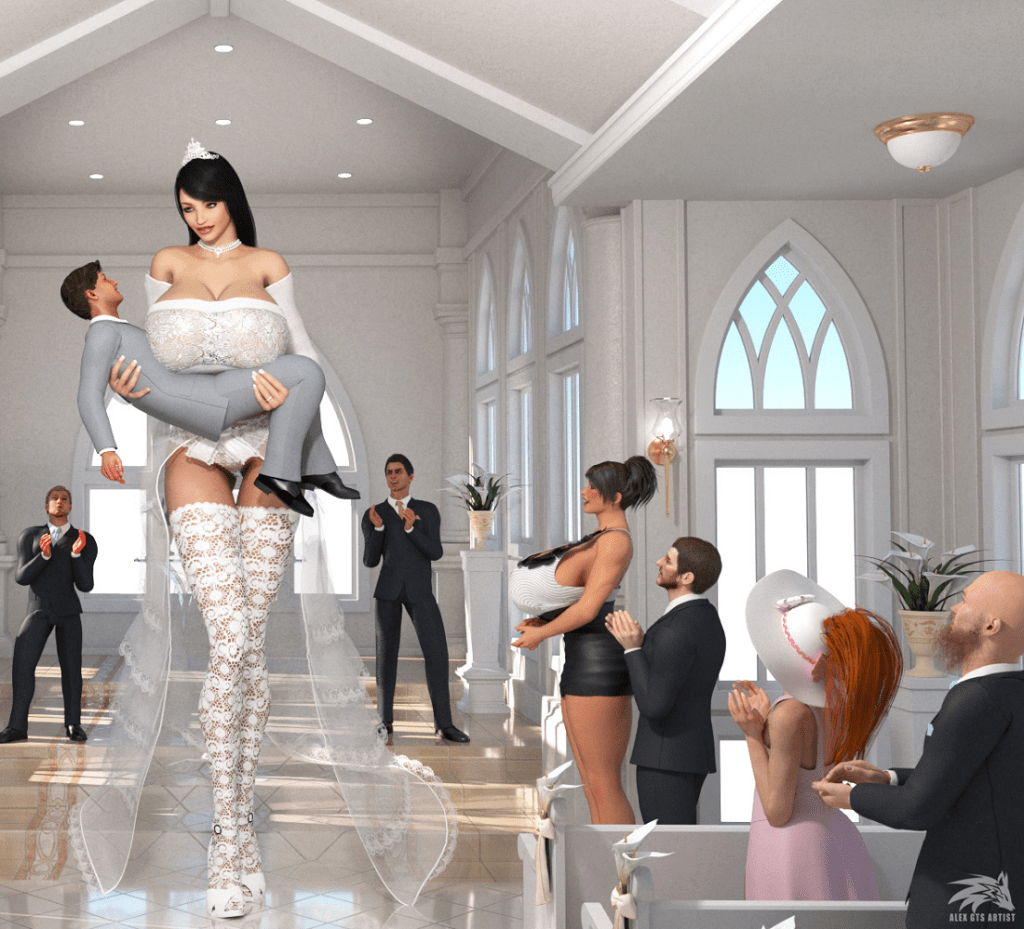 Between March and May 2024 Alex GTS Artist published several wedding-themed images at DeviantArt as part of the long-running Growth Diary series. These delightful computer-rendered images caught my fancy. Something about the common occurrence of young people getting married combined with the fantasy of the bride growing taller every day really hit the spot! Fans can read an interview with Alex here.