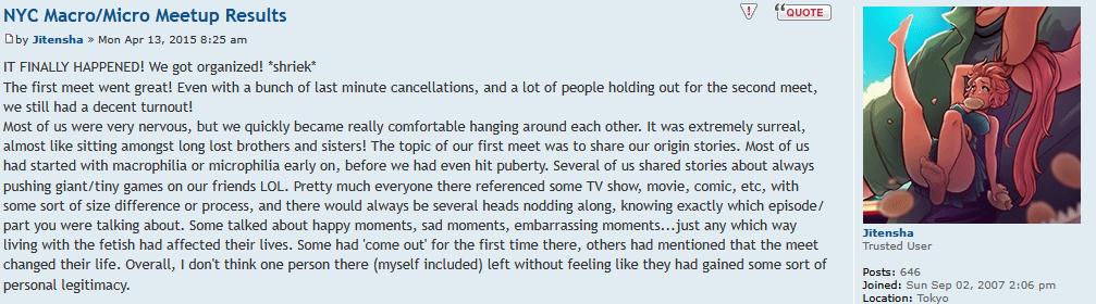 So, I bit the bullet and bought tickets. I was finally able to meet many online friends in person. Introductions started with Taedis whose bright yellow hat was visible from a distance then Olo found his way to the Size Library and Museum (SLaM) and finally I put a face to Aborigen’s name. Surreal talking to people who could have been online-only acquaintances forever. Also odd to be in a situation where like-minded individuals nonchalantly discuss macrophilia. Liberating to scroll through one’s phone without concern. There was no thought of “Shit, there’s a screenshot of berggie’s giant girls embracing. Gotta make sure no one sees that!” SizeCon provided a physical space to be ourselves.