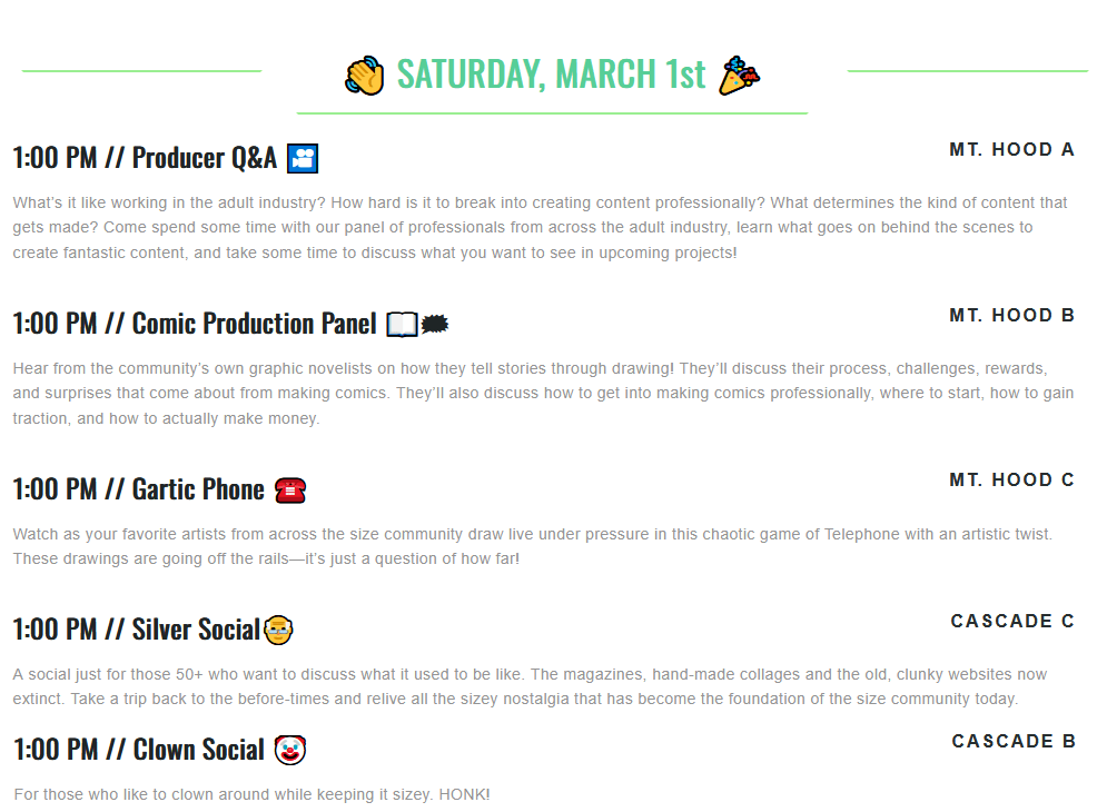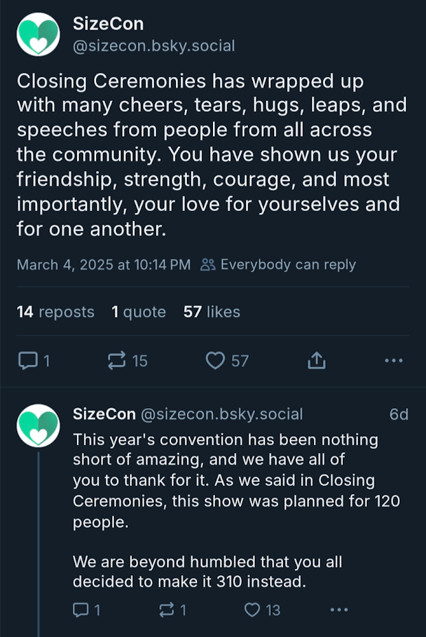 SizeCon 2025 was a success. That fact is indisputable and was proven by the overwhelmingly positive testimonies given on the last day. Additionally, SizeCon is run by volunteers so making recommendations for future SizeCons must be done while keeping in mind that no one is getting rich off these conventions, but rather these events are labors of love. Nonetheless, progress marches ever onward and the best times are yet to come. Hopefully, these recommendations merit consideration.