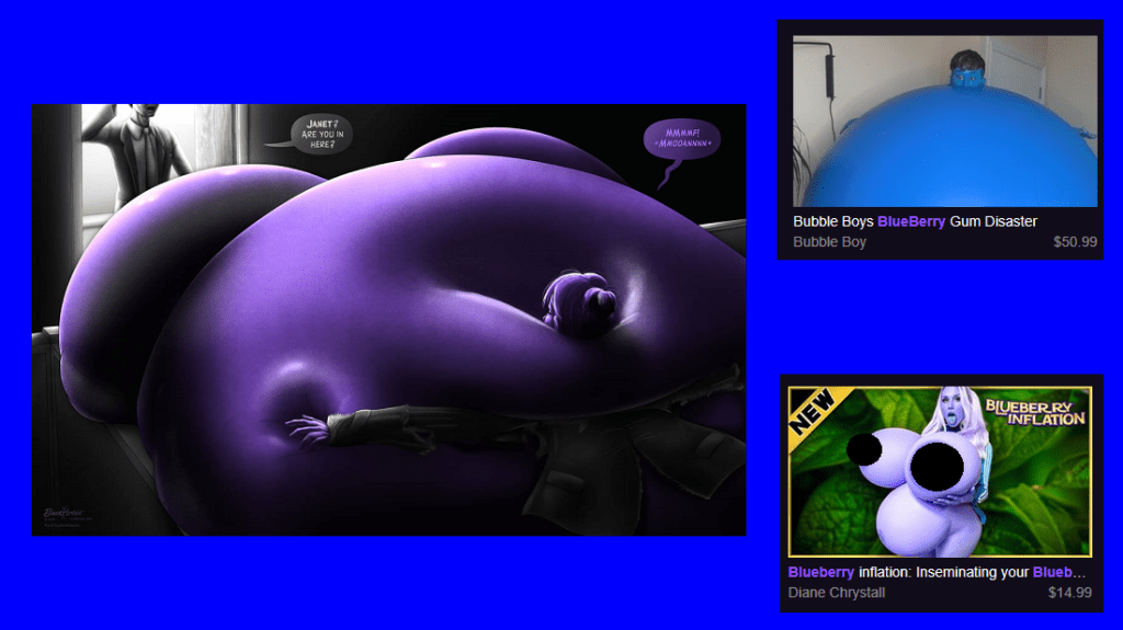 With that background, let me now outline the story. Most readers are probably familiar with the scene in 1971’s “Willy Wonka & the Chocolate Factory” which spawned the blueberry inflation genre. That movie adapted Roald Dahl’s 1964 book “Charlie and the Chocolate Factory.” Since then artists such as BustArtist and adult models such as Bubble Boy and Diane Chrystall have produced blueberry inflation content.