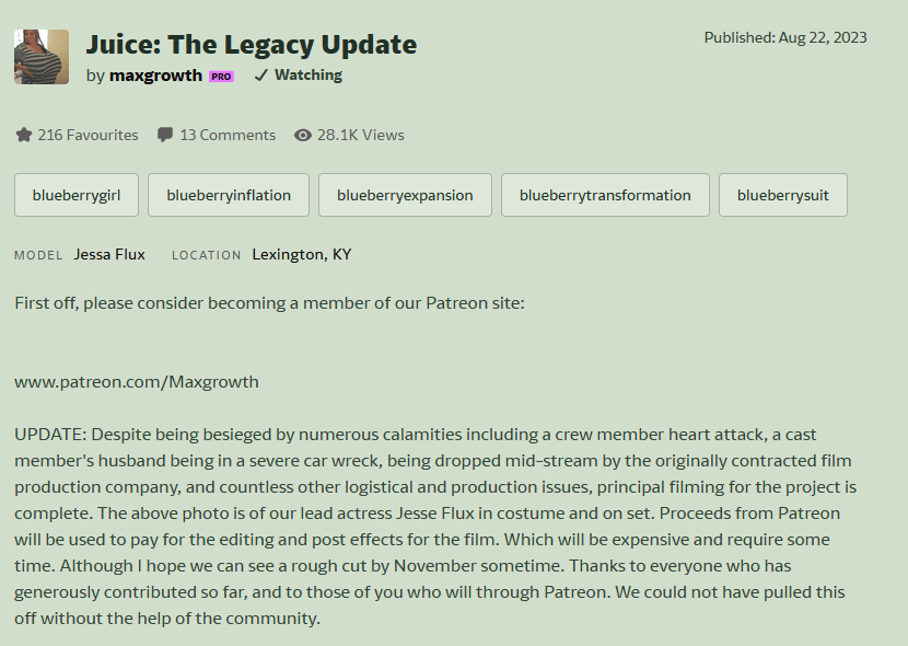 Maxgrowth Productions is based out of Lexington, Kentucky, and makes PG-13 rated fantastical special interest video clips. Special interests in this case are female breast expansion (B.E.) and body inflation with physical prosthetics used to achieve the illusion of growing breasts and swelling bellies. These clips are PG-13 meaning they do not include nudity or overt sex acts. Also of interest, Maxgrowth has assisted and been involved in SizeCon since the beginning. Helping out the size community as a whole is pretty darn cool in my book! (SIDE NOTE: Click here for a 2019 interview with Maxgrowth.)