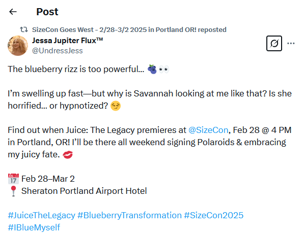 This 24-minute film premiered at 4PM on February 28th during SizeCon 2025 in Portland, Oregon. Yours truly was fortunate enough to attend! (FULL DISCLOSURE: Maxgrowth also provided me a review copy.) Before I discuss Juice, let me briefly describe the people behind this work.