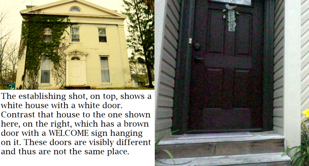Regarding aspects which could be improved, the two most significant issues were continuity and sound mixing. Starting with continuity there were a few instances when it was slightly confusing whether separate events were taking place in the same place. To give one instance there were establishing shots of the Beauxregard house, seen on the left side of the following screenshot, but in closeups, on the right side of the screenshot, the front door of the house was clearly different. In the establishing shot the door was white while in close-ups that same door was a dark brown. Ideally, the establishing shots would match the close-ups.