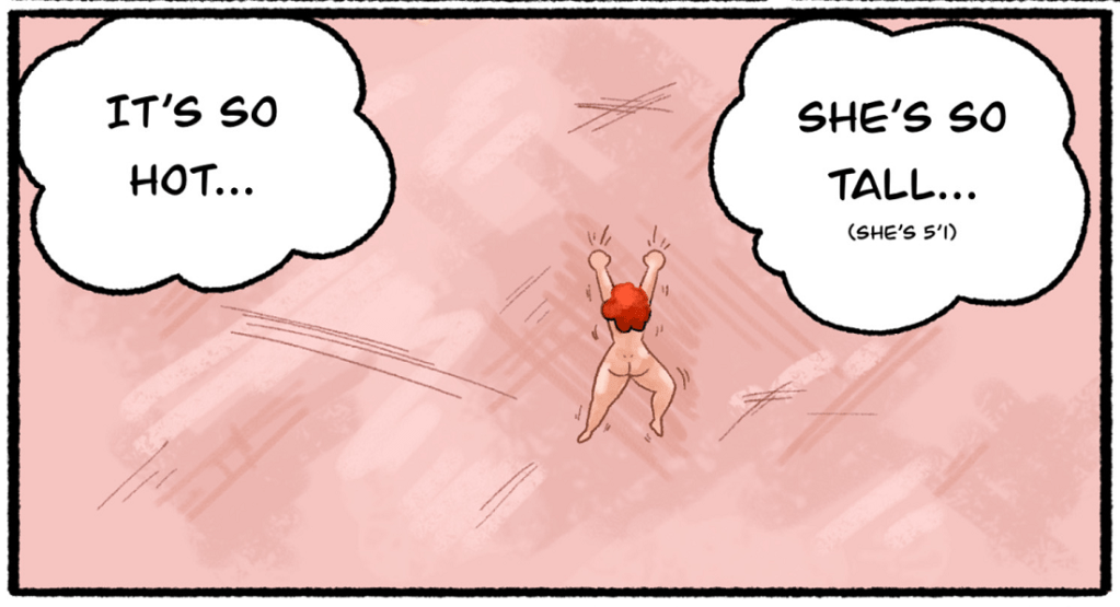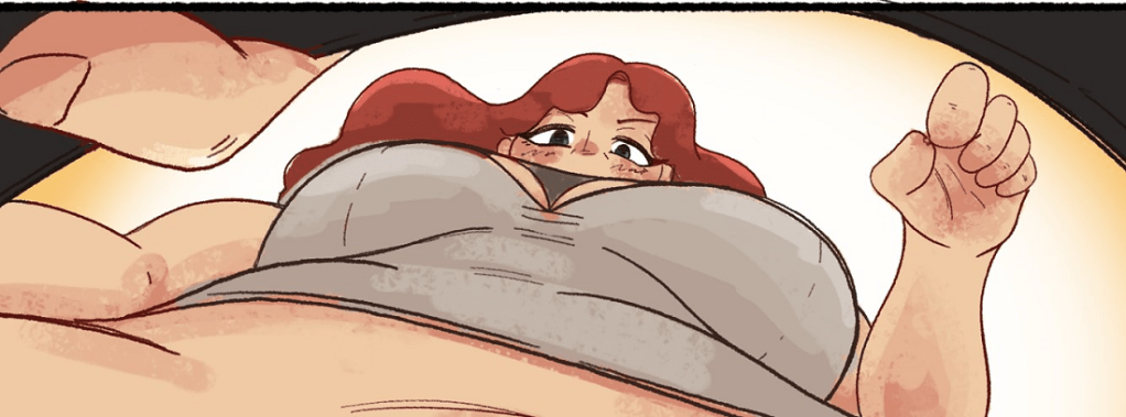 I’d describe my work as pretty grounded. Whether it’s a modern slice of life or fantasy, I enjoy keeping a foot firmly rooted in a shared experience. Sometimes that’s something more tangible someone’s experienced, or more abstract feelings that you can relate to through the lens of size. My work can also be a bit less ‘thinky’, and a lot of the time I do a lot of what I would describe as a “and then they fuck” comic; meaning it’s kind of just focused on the horny fun of the sizey scenario. But even in that, the characters I draw will be grounded and a lot of that is expressed through more realistic body shapes and angles.