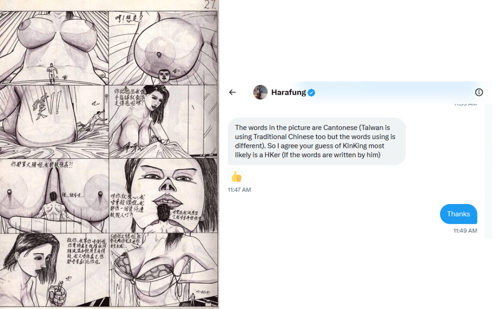 KlnKing published several comics, labeled Unknown A through Unknown G, with traditional Chinese writing (as opposed to the simplified Chinese used in mainland China). A poster at Giantess City claimed that the text was Cantonese, a language native to Hong Kong (also used in a few neighboring provinces in mainland China plus among overseas Chinese). The majority of China speaks standard Chinese (also called Mandarin or Putonghua), but other Chinese languages (such as Cantonese, Hakka, and Shanghainese) are used as well as more distinct languages (such as Tibetan, Uyghur, and Zhuang).