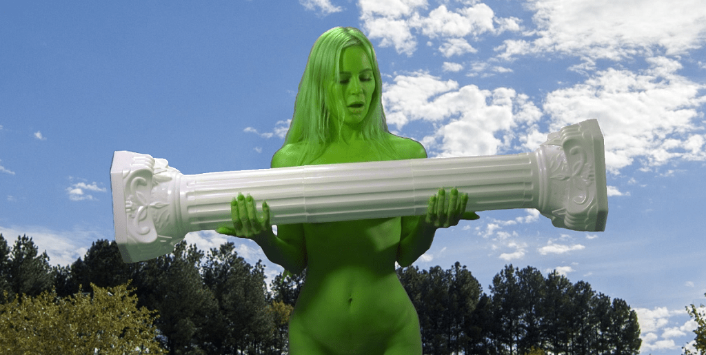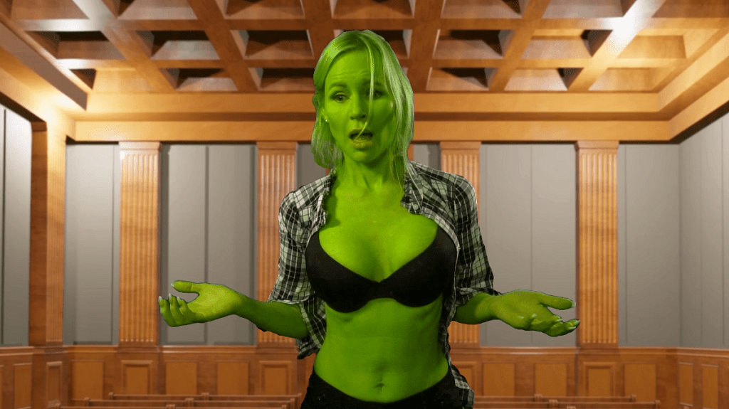 This clip is a homage to She-Hulk so our protagonist also experiences a She-Hulk like transformation during her court appearance into a green-skinned being just like Marvel’s Jennifer Walters does. Although, She-Hulk is most often portrayed as a tall human, but not someone who is superhumanly tall. The Official Handbook of the Marvel Universe lists her height, in hulk form, as six foot seven inches. So, She-Hulk could perhaps be most accurately labeled as an Amazon not a giantess. However, in this video the performer grows much taller than a paltry six feet. In fact, her height extends more and more until she can no longer fit inside the courthouse.