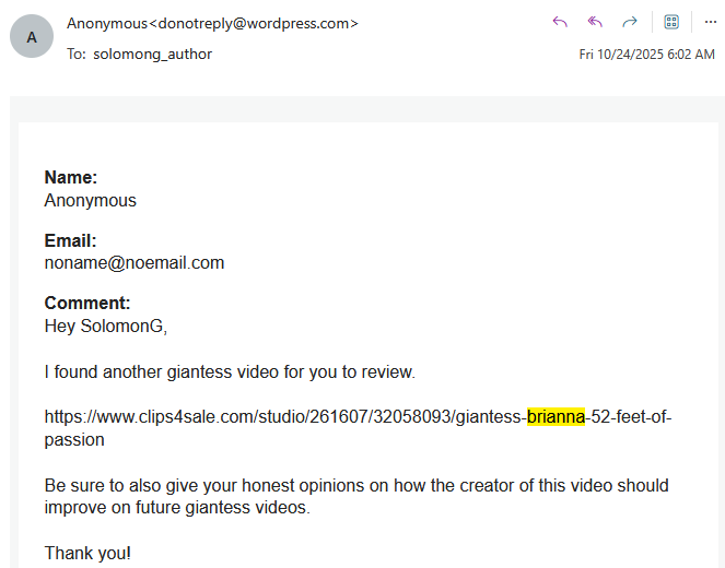 Today’s review will look at “Giantess Brianna 52 feet of passion” by Hard Honey Studio. Per their X/Twitter profile, they are located on Vrachos beach in Greece. A studio making CGI erotica should be easy to spot on that narrow strip of land near the ocean. Although, their seashore location does beg the question: How do they keep all that coarse sand out of their fragile computers rendering CGI erotica? Hard Honey Studio is a seemingly new studio selling mostly size-related content including growing women, shrinking men, tiny men (men who were not shrunk, but instead were tiny from the get-go), as well as a single video, called “Mistress Diana dog trainer,” of a dominatrix treating a man like a dog. They joined X/Twitter in March 2024 and their oldest video, “Mistress Diana tinny slave,” at Clips4Sale dates to May 2024. However, their About page at Patreon claims that they are an “… experienced studio with over a decade of expertise in creating NSFW animations and games.” Furthermore, their LinkedIn page states they are based out of Novi Sad in the Republic of Serbia (RS) and that they were founded in 2011. That makes more sense to me since there is less sand in a landlocked city like Novi Sad and less ocean spray; so, it is a safer place to keep sensitive electronics.