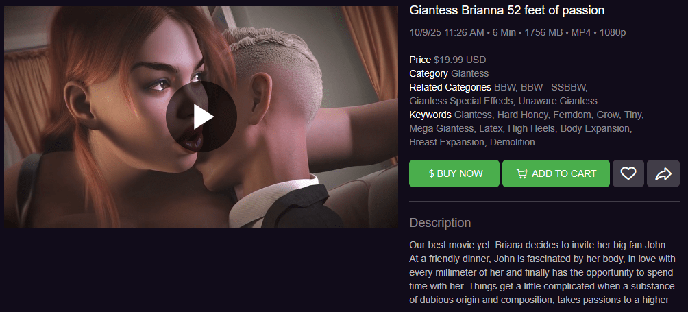 Giantess Brianna 52 feet of passion released on October 9, 2025 and runs for a bit under six minutes. At the time of my purchase it sold for $19.99, but later on there was a brief Pre-Black Friday sale when it was discounted to $18. The clip featured gentle growth as Brianna turned into a 52-foot-tall giantess and John experienced penis enlargement all thanks to a “substance of dubious origin and composition” in Brianna’s possession. (NOTE: “Gentle” growth insomuch as no one got seriously hurt, but the house sure took a beating!)