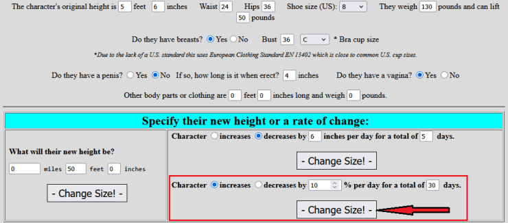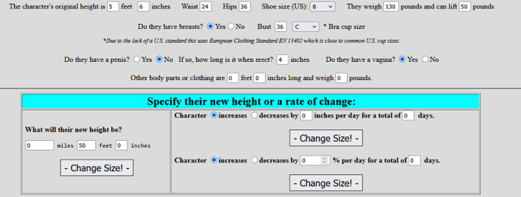 Computing the size of a character after they increase or decrease in size by a set percentage each day. Answering questions like how large would a 5’6″ woman’s 36C breasts be after she increased in height by 10% per day for a period of thirty days. Answer is she would have a 52’6″ bust. A slew of other measurements are also given in standard (ergo feet and inches) and metric (ergo meters and centimeters).