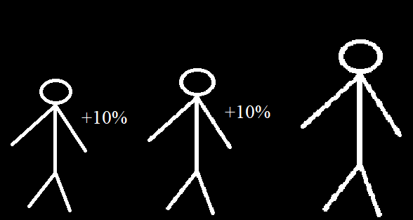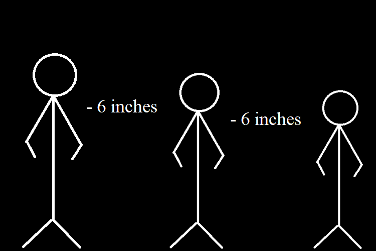 Computing the size of a character after a set amount of days in which they decrease or increase in size by a number of specified inches. This answers questions like “How high above ground are a 5’6″ man’s knees after he has lost 6 inches of height per day for a period of 5 days?” The answer is his knees would be 9.6″ off the ground after five days of shrinking by that consistent amount.