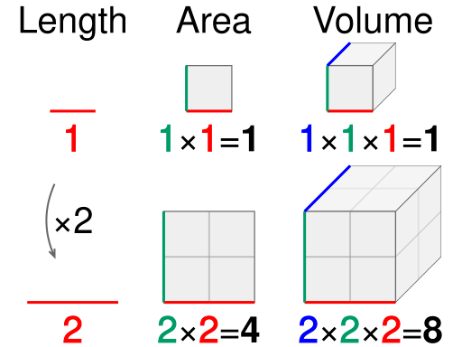 This calculator computes data using the square-cube law. Humans are three dimensional beings and this calculator assumes that a human will change equally in all three of those dimensions. If their height increases in size by a factor of 2 then their other two dimensions will also increase in size by a factor of 2. So, a man who is twice as tall as when he started ergo if he increased in size by a factor of 2 then he will weigh eight times as much (since weight is a measure of mass which is determined by volume). This is because his volume is that factor cubed, 2 x 2 x 2. (Click here to learn more about the square-cube law.)