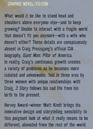 Dark Horse Comics published Matt’s graphic novel 3 Story in 2009. The comic follows the life of Craig Pressgang, a man from Buffalo, New York, who never stops growing throughout his life. He was born in the mid-1940s to a father (nicknamed Butchy) who died in World War II without ever meeting him and to a mother (Marge) who never recovered from her husband’s death. Three women (Craig’s mother, wife Jo, and daughter Iris) narrate the sad details of Craig’s life setting up a parallel with the title referring to his height at one point in his life and also referring to the three different perspectives (three stories) in his biography.