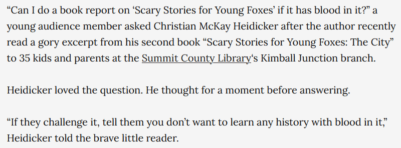 During an early May 2024 public reading in Kimball Junction (part of Snyderville), Utah, Heidicker told a student that if school faculty objected to a book report discussing blood then the student should tell those teachers that he does not “… want to learn any history with blood in it.“